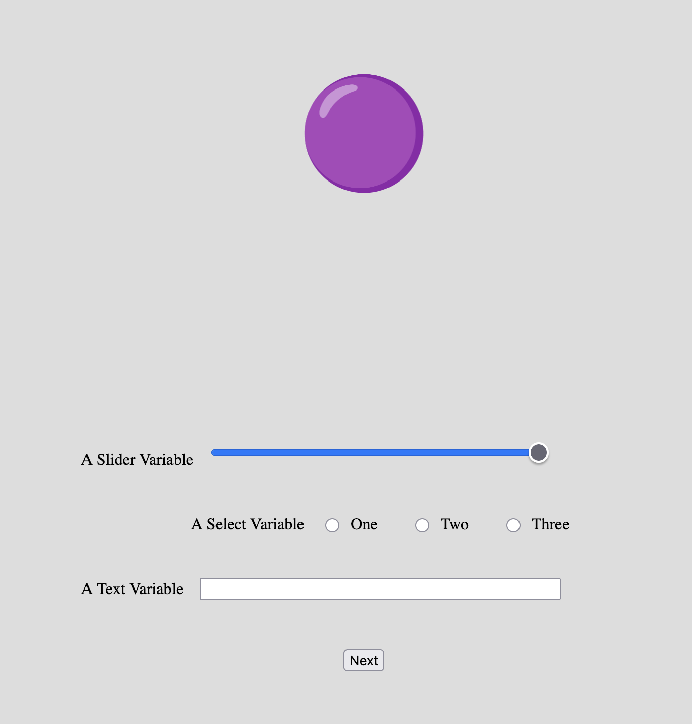 Example Stimulus Form showing a stimulus (purple sphere) with three types of form elements: a slider, radio buttons, and a text input field.